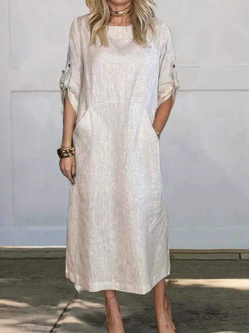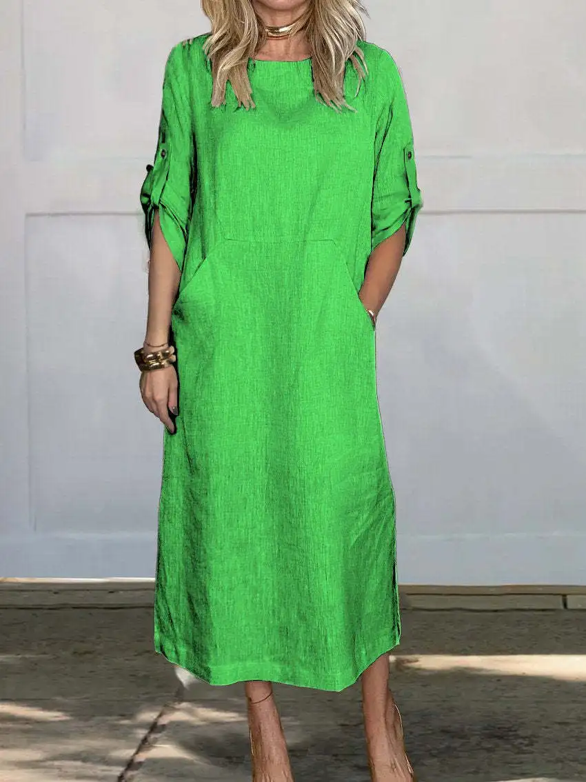 Cotton Linen Dress For Women 2024 Summer Loose Casual Solid Color Short-sleeved Pockets Long Dresses Elegant Women's Clothing