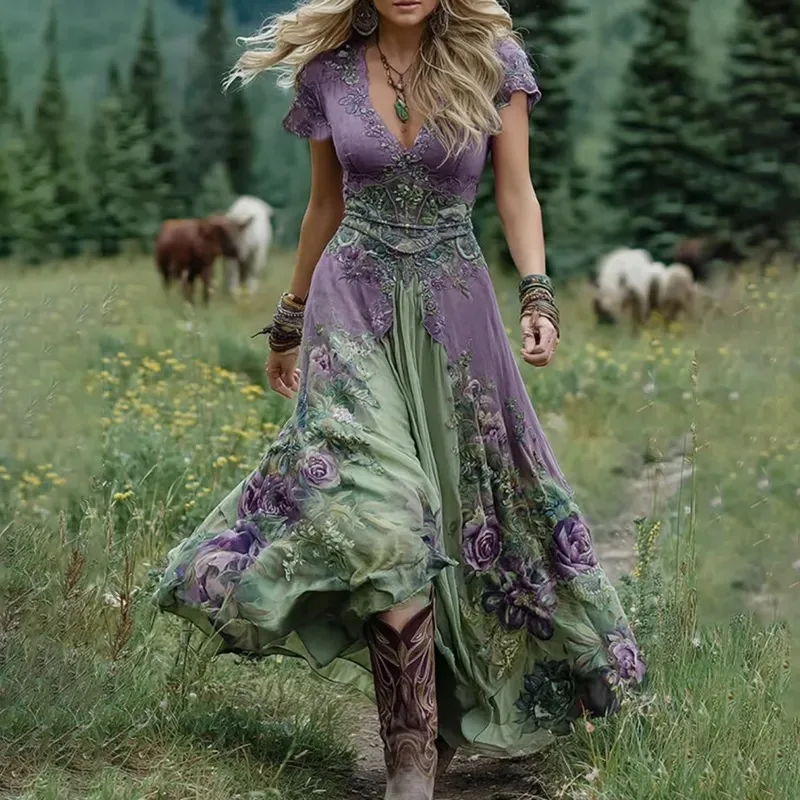 Creative Totem Print V-neck Short Sleeve Midi Dress Polyester Fabric 3D Effect Street Style Women's Summer New Fashion Dress