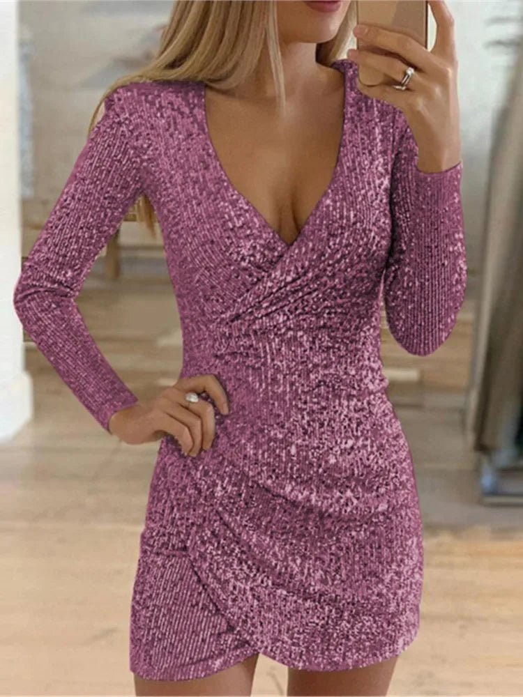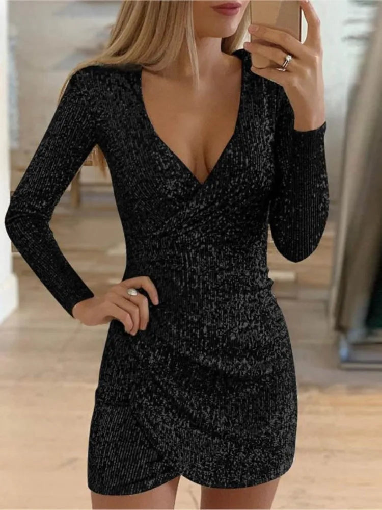 Dresses For Women 2025 Sexy Deep V-Neck Silver Sequin Mini Bodycon Dress Spring Autumn Long Sleeve Party Dress Female