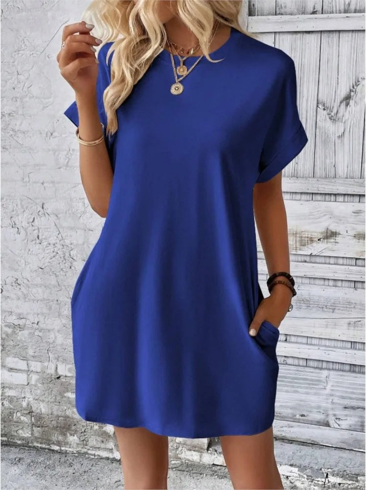 Fashion Boho Resort Style Beach Dresses For Women 2024 New Summer Solid Color O Neck Loose Short Sleeve Pocket Mini Dress Femme