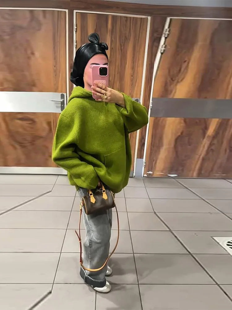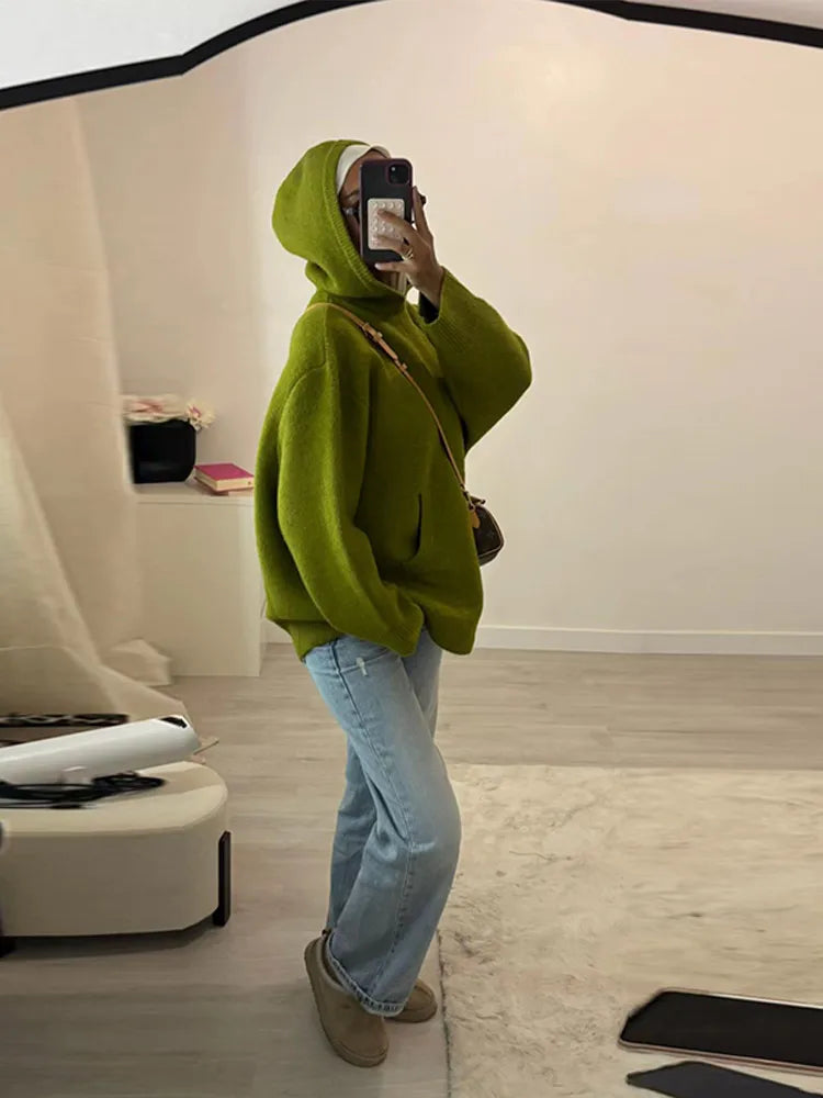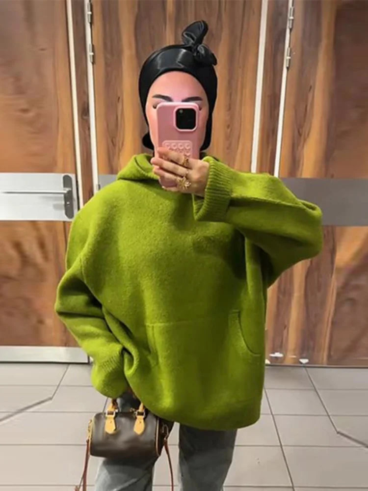 Fashion Lady Knitted Hoodies Sweater Long Sleeve Pocket Drop Shoulder Loose Solid Sweaters Autumn Winter Commuter All-match Tops