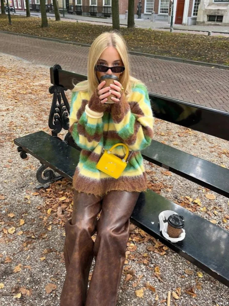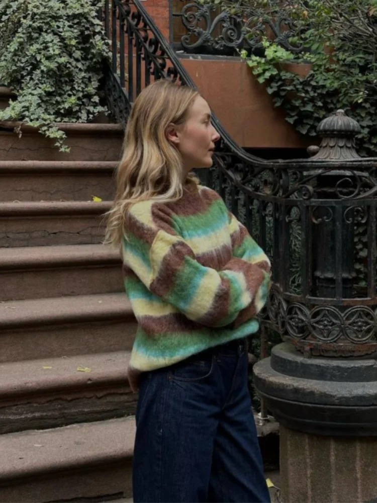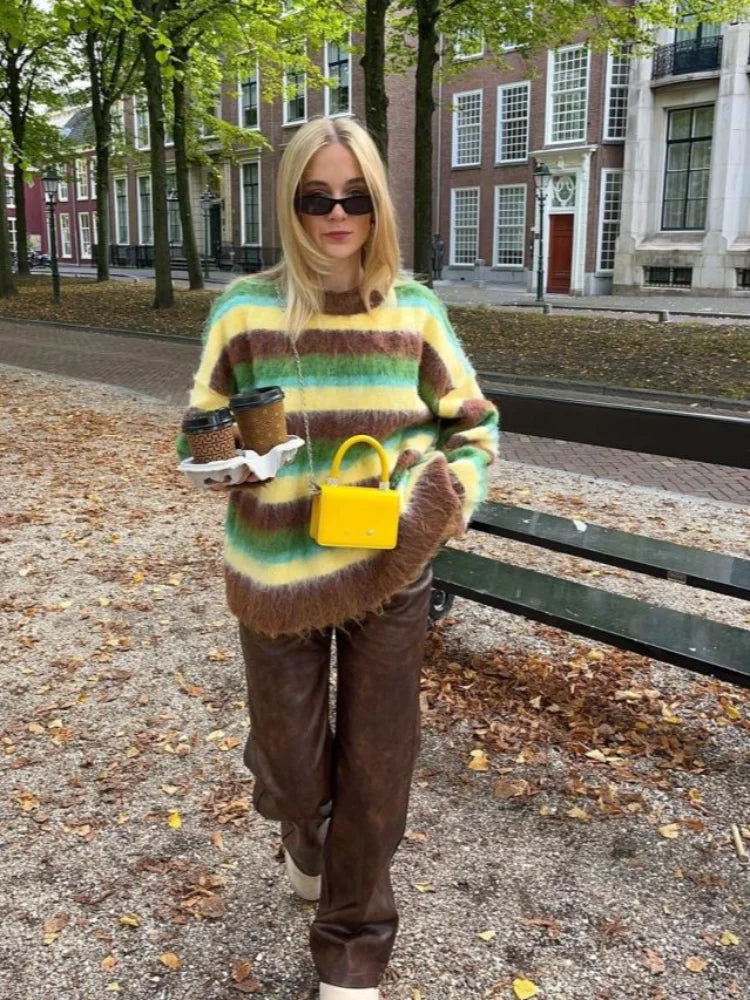 Casual Striped Knitted Fuzzy Sweater Women Cozy Loose Colorful O-neck Full Sleeves Pullover Sweaters Female Autumn Chic Lady Top