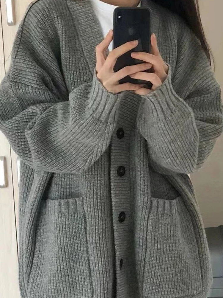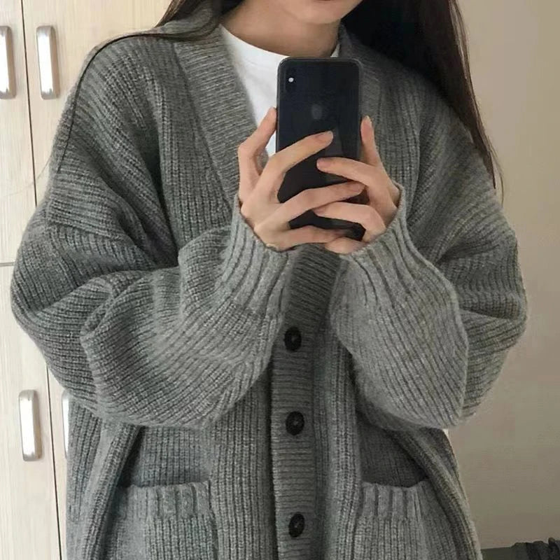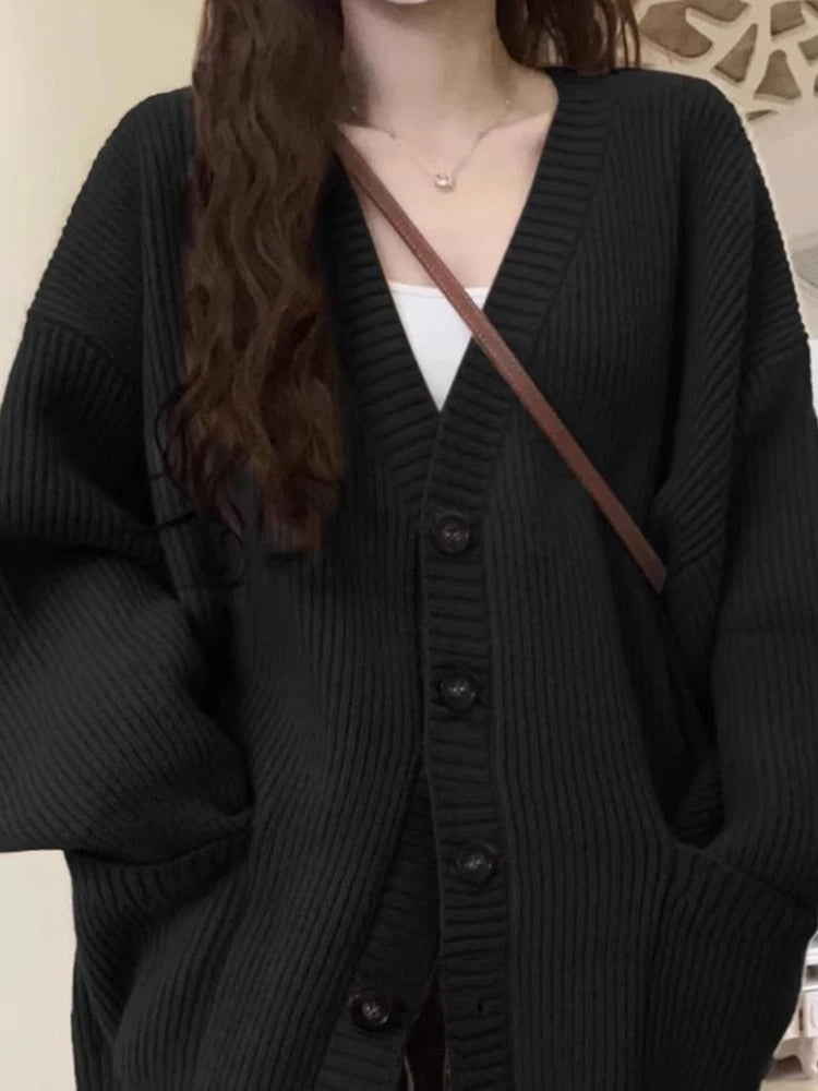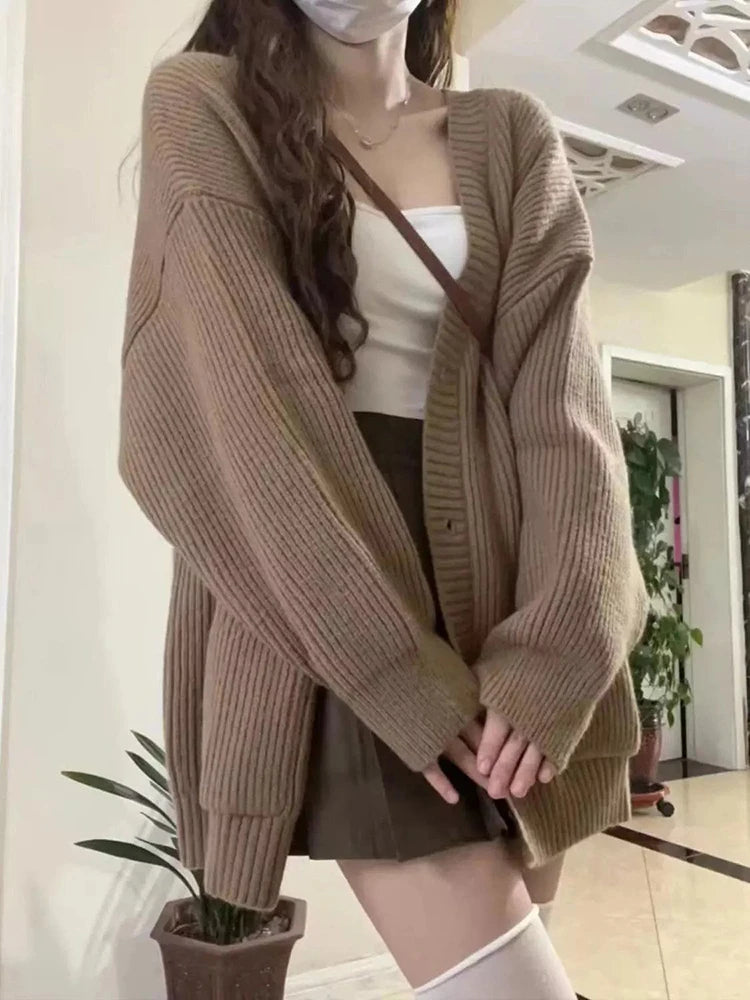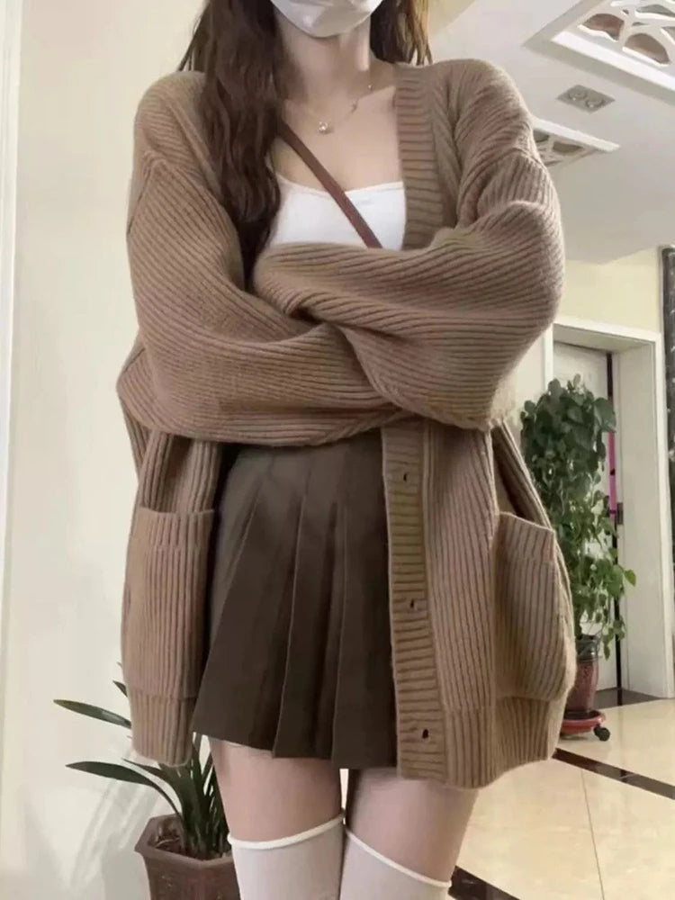 Japanese Sweet Knitted Cardigan Women Fall Winter Lazy Wind Loose Casual Sweaters V Neck Solid Student Fashion Elegant New Coats