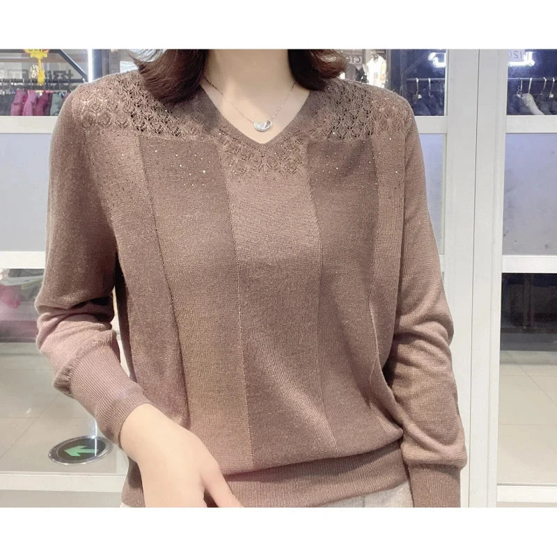 Korean Autumn/Winter New Sweaters Women's V-Neck Solid Hollow Out Simplicity Versatile Loose Long Sleeve Pullovers Knitted Tops