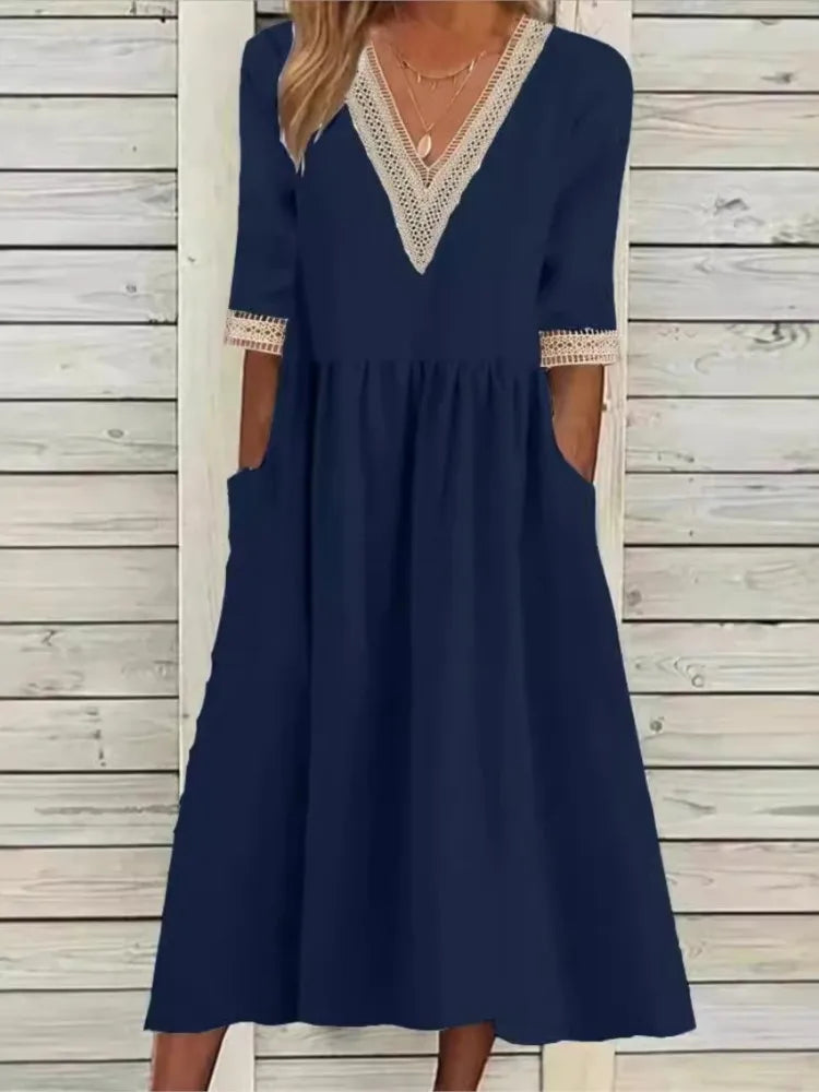 Loose Lace Splicing V Neck Half Sleeve Long Dress Women Solid Cotton Linen Dresses Female Srping Summer Pocket Robe Femme