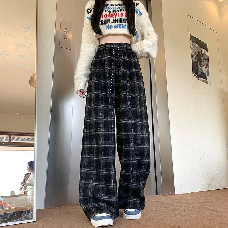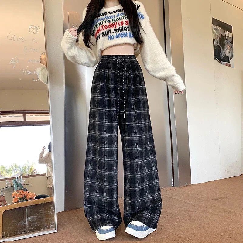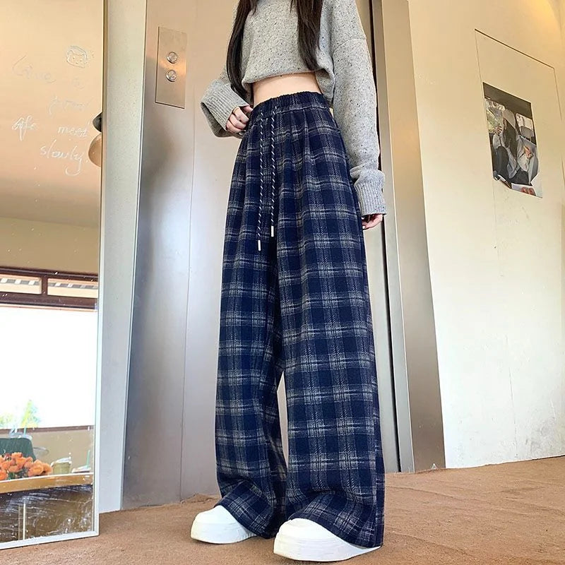 New Retro Plaid Pants Women in Spring and Autumn Casual High-waisted Versatile Straight Loose Floor Plaid Wide-leg Pants