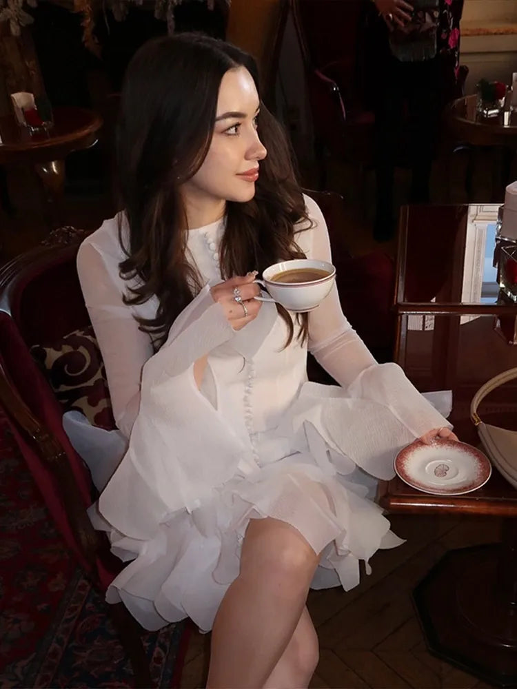Puffy Flared Long Sleeve Dress Waist Cinched Round Neck Big Skirt Hem Party Gown French Slim Fit Fairy Short Dresses Summer New