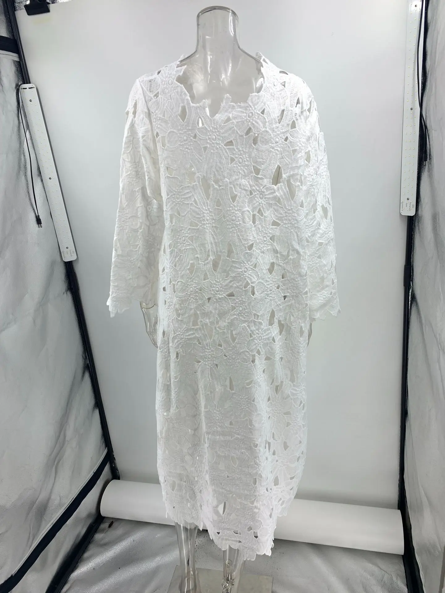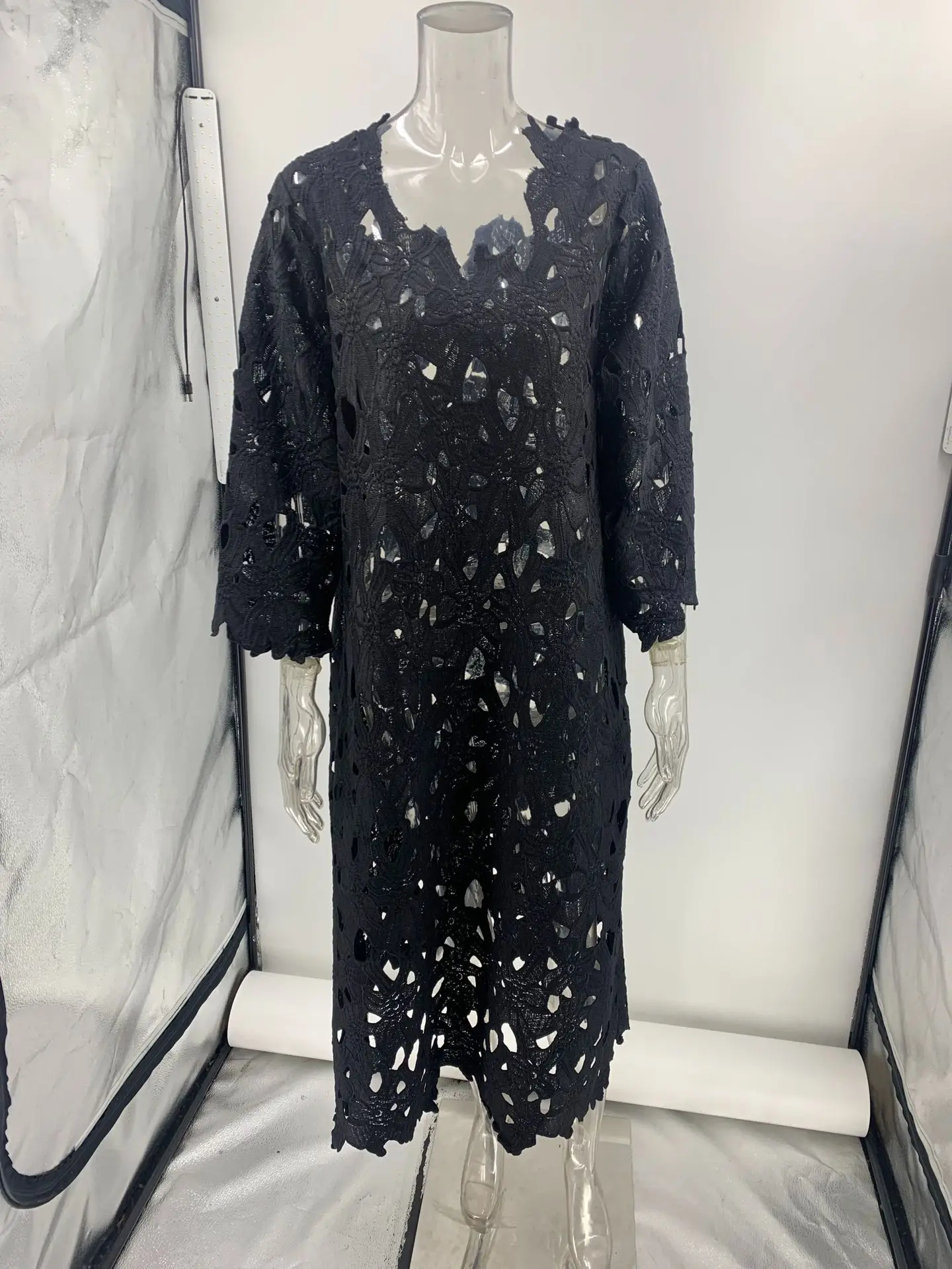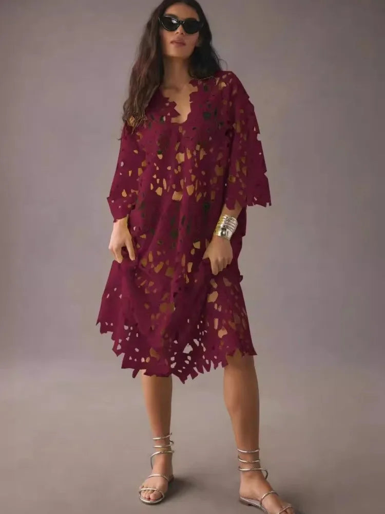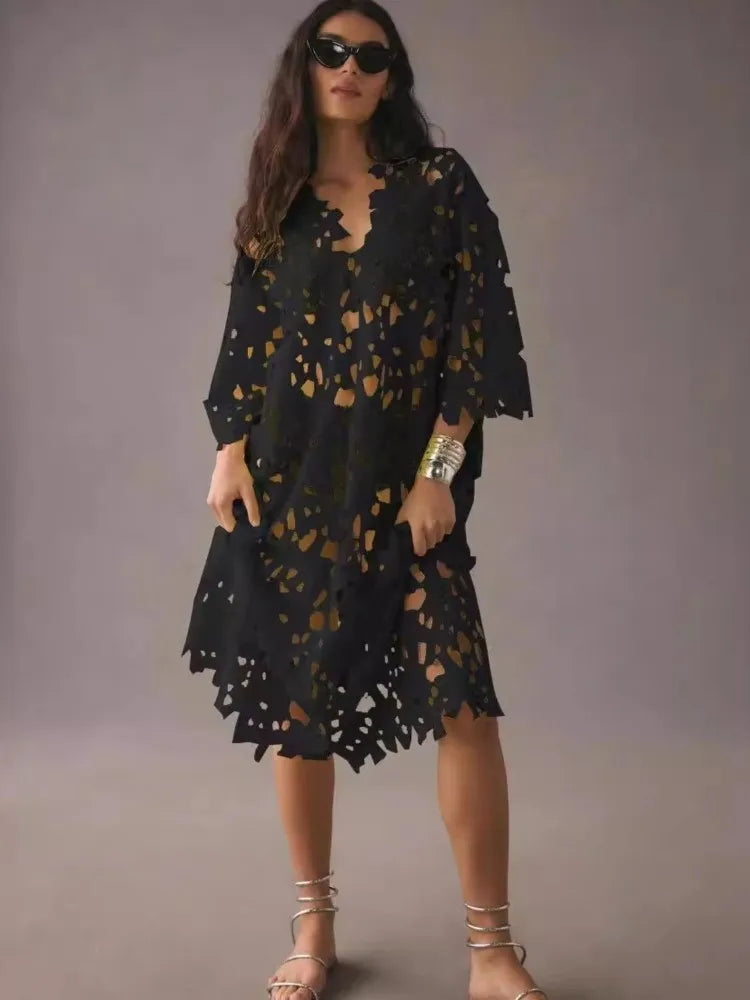 Sexy Lace Hollow Out V-neck Dress For Women Elegant Solid Long Dresses Ladies Summer Casual Beach Vacation Loose Vestidos